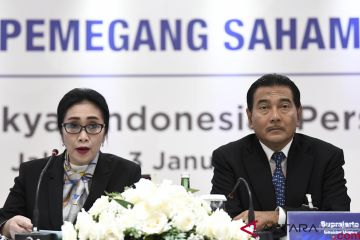 Direktur Utama Bank Rakyat Indonesia Suprajarto (kanan) bersama Direktur Konsumer Handayani menyampaikan keterangan terkait Rapat Umum Pemegang Saham Luar Biasa PT Bank Rakyat Indonesia Tbk (BRI) di Jakarta, Kamis (3/1/2019). RUPSLB tersebut menyetujui perubahan pengurus perseroan diantaranya pemberhentian Kuswiyoto sebagai direksi dan menambah nomenklatur Wakil Direktur Utama yang dijabat oleh Sunarso. ANTARA FOTO/Puspa Perwitasari/pras.