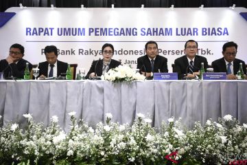 Direktur Utama Bank Rakyat Indonesia Suprajarto (ketiga kanan) bersama direksi menyampaikan keterangan terkait Rapat Umum Pemegang Saham Luar Biasa PT Bank Rakyat Indonesia Tbk (BRI) di Jakarta, Kamis (3/1/2019). RUPSLB tersebut menyetujui perubahan pengurus perseroan diantaranya pemberhentian Kuswiyoto sebagai direksi dan menambah nomenklatur Wakil Direktur Utama yang dijabat oleh Sunarso. ANTARA FOTO/Puspa Perwitasari/pras.