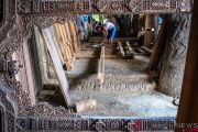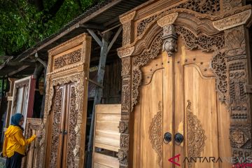 Calon pembeli melihat hasil kerajinan ukiran furnitur gapura berbahan baku kayu jati di industri rumahan Desa Bango, Demak, Jawa Tengah, Selasa (8/1/2019). Berbagai macam bentuk motif ukir furnitur untuk dekorasi rumah joglo khas Jawa itu dipasarkan ke sejumlah wilayah di Indonesia hingga menembus pasar Malaysia dengan harga Rp3,5 juta-Rp500 juta per unit, tergantung ukuran dan tingkat kesulitan pembuatannya. ANTARA FOTO/Aji Styawan/foc.