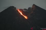 Guguran lava pijar Gunung Merapi terlihat dari Bukit Klangon, Cangkringan, Sleman, DI Yogyakarta, Selasa (15/1/2019) dini hari. Menurut data Balai Penyelidikan dan Pengembangan Teknologi Kebencanaan Geologi (BPPTKG) Yogyakarta, volume kubah lava per Kamis (10/1) mencapai 439.000 meter kubik dengan laju pertumbuhan 3.400 meter kubik per hari. ANTARA FOTO/Hendra Nurdiyansyah/foc.