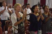 Seorang turis asal Swiss ikut memberi dukungan saat nonton bareng debat capres 2019 di GOR Segara Prancak, Badung, Bali, Kamis (17/1/2019). ANTARA FOTO/Nyoman Hendra Wibowo/pras.