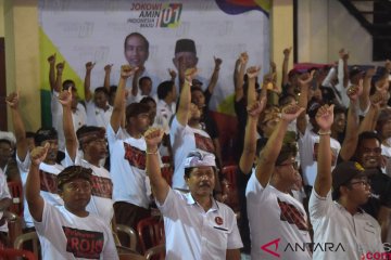 Pendukung pasangan calon Presiden-Wakil Presiden, Joko Widodo-Ma'ruf Amin meneriakkan yel-yel saat nonton bareng debat capres 2019, di GOR Segara Prancak, Badung, Bali, Kamis (17/1/2019). ANTARA FOTO/Nyoman Hendra Wibowo/pras.