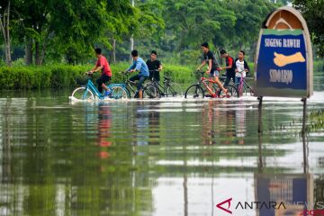Sejumlah anak melintas di Jalan Raya yang terendam banjir di Porong, Sidoarjo, Jawa Timur, Sabtu (19/1/2019). Banjir yang diakibatkan curah hujan tinggi sejak Jumat (18/1) malam tersebut mengakibatkan jalan raya Porong terendam air setinggi 70 cm. ANTARA FOTO/Umarul Faruq/foc.