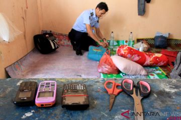 Sejumlah petugas memeriksa barang-barang milik narapidana saat melakukan razia di Lembaga Pemasyarakatan (Lapas) kelas II B Meulaboh, Aceh Barat, Aceh, Sabtu (19/1/2019). Sebanyak 59 unit telepon genggam dan beberapa senjata tajam ditemukan saat razia tersebut. ANTARA FOTO/Syifa Yulinnas/wsj.