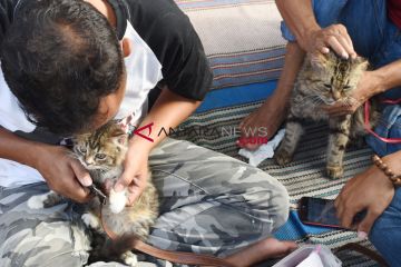 Anggota Komunitas Pecinta Kucing Madiun Plus (KPKM-Plus) melakukan perawatan kucing saat Bakti Sosial (Baksos) gratis perawatan kucing di Kota Madiun, Jawa Timur, Minggu (20/1/2019). Dalam kegiatan tersebut, KPKM-Plus memberikan berbagai layanan gratis untuk kucing, antara lain perawatan bulu, telinga, mata, potong kuku, pemberian vitamin dan obat anti cacing. ANTARA FOTO/Siswowidodo/ama.