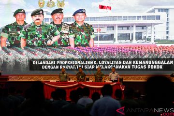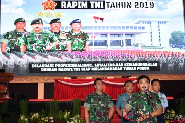 Panglima TNI Marsekal TNI Hadi Tjahjanto (kedua kanan) didampingi KASAD Jenderal TNI Andika Perkasa (kiri) KASAL Laksamana TNI Siwi Sukma Adji (kedua kiri) dan KASAU Marsekal TNI Yuyu Sutisna memberikan keterangan pers seusai penutupan Rapat Pimpinan (Rapim) TNI Tahun 2019, di Mabes TNI, Cilangkap, Jakarta Timur, Kamis (31/1/2019). Rapim bertema "Dilandasi Profesionalisme, Loyalitas, dan Kemanunggalan dengan Rakyat, TNI Siap Melaksanakan Tugas Pokok" tersebut resmi ditutup. ANTARA FOTO/Sigid Kurniawan/hp.