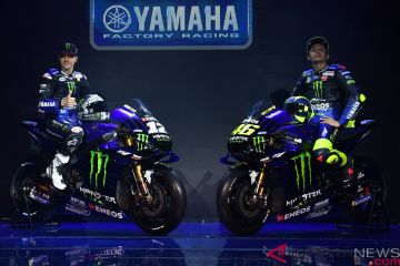 Pebalap MotoGP Valentino Rossi (kanan) dan Maverick Vinales berpose di samping motor YZR-M1 saat peluncuran Monster Energy Yamaha MotoGP Team di Jakarta, Senin (4/2/2019). Peluncuran tim baru dengan tema "Beast Mode On" tersebut sebagai tanda adanya kesepakatan sponsorship antara Yamaha dengan Monster Energy serta kesamaan visi untuk menghadapi musim balap 2019. ANTARA FOTO/Sigid Kurniawan/foc.
