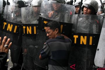 Pengunjuk rasa berusaha menerobos blokade pasukan TNI Angkatan Laut pada simulasi pengamanan Pemilihan Umum (Pemilu) 2019 di Mako Lantamal VI, Makassar, Sulawesi Selatan, (4/2/2019). Sebanyak 500 personil Pangkalan Utama TNI AL VI mengikuti simulasi pengamanan Pemilu 2019 yang akan berlangsung April mendatang. ANTARA FOTO/Arnas Padda/YU/hp.
