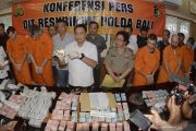 Pihak kepolisian menunjukkan sejumlah tersangka kasus tindak pidana pencurian data nasabah (skimming) berkewarganegaraan Bulgaria beserta barang bukti saat rilis di Polda Bali, Denpasar, Bali, Kamis (7/2/2019). Petugas berhasil menangkap lima orang tersangka warna negara Bulgaria berinisial TKD, IFT, GJJ, AIP dan VNP dan mengamankan sejumlah barang bukti seperti 227 kartu ATM palsu, uang tunai Rp788 juta, router, tiga buah laptop dan beberapa unit alat skimmer. ANTARA FOTO/Fikri Yusuf/hp.