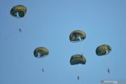 Prajurit Paskhas TNI AU terjun dari pesawat Herculues A-1318 saat Latihan Terjun Penyegaran (Junggar) di Pangkalan Udara Sultan Iskandar Muda, Aceh Besar, Aceh, Jumat (8/2/2019). Latihan Terjun Penyegaran dan dilanjutkan Terjun Free Fall itu melibatkan sebanyak 105 prajurit untuk meningkatkan kemampuan dan profesionalisme TNI AU. ANTARA FOTO/Ampelsa/hp