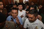 Terdakwa kasus pencemaran nama baik Ahmad Dhani (tengah) didampingi petugas meninggalkan ruang sidang usai menjalani sidang lanjutan di Pengadilan Negeri (PN) Surabaya, Jawa Timur, Selasa (12/2/2019). Sidang kedua tersebut beragendakan pembacaan eksepsi atau nota keberatan atas dakwaan jaksa penuntut umum dalam kasus dugaan pencemaran nama baik. ANTARA FOTO/HO/Ali Masduki/pras.
