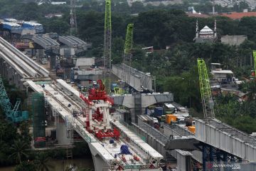 Pekerja menyelesaikan pembangunan Jalan Tol layang Jakarta-Cikampek II (Elevated Toll), di ruas Jalan Tol Jakarta-Cikampek, Bekasi, Jawa Barat, Rabu (13/2/2019). PT Jasa Marga Jalan Layang Cikampek (JCC) menargetkan penyelesaian pembangunan jalan tol layang Jakarta-Cikampek II (elevated toll) sepanjang 36 kilometer tersebut pada pertengahan 2019, dan dapat difungsionalkan saat arus mudik dan balik lebaran 2019 mendatang. ANTARA FOTO/Risky Andrianto/wsj.