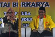 Juru Kampanye Partai Berkarya (PB) Siti Herdiyanti Rukmana atau Mba Tutut (kiri) didampingi Ketua DPW PB Banten Heldi Agustian (kanan) berpidato saat melakukan safari politik di Pelabuhan Karangantu, Serang, Banten, Kamis (14/2/2019). Kepada para nelayan Siti Herdiyanti Rukmana berjanji akan meningkatkan kesejahteraan para petani dan nelayan dengan menyediakan alat bantu produksi yang murah dan berkualitas. ANTARA FOTO/Asep Fathulrahman/hp.