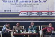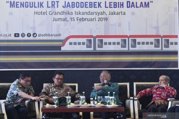 Direktur Utama PT Adhi Karya Budi Harto (kedua kanan) bersama Direktur Operasional II PT Adhi Karya Pundjung Setya Brata (kedua kiri), Kepala Daop 1 PT KAI John Roberto Siahaan (kiri) dan Ketua Bidang Advokasi Masyarakat Transportasi Indonesia Darmaningtyas (kanan) menjadi pembicara dalam diskusi terkait LRT Jabodebek di Jakarta, Jumat (15/2/2019). Diskusi tersebut membahas tepat guna pembangunan infrastruktur transportasi LRT Jabodebek. ANTARA FOTO/Hafidz Mubarak A/hp.