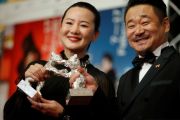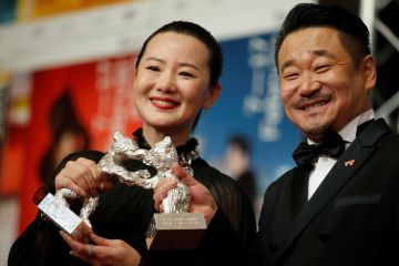 Aktor Wang Jingchun (kanan) dan aktris Yong Mei berpose sambil memegang trofi Beruang Perak untuk Aktor dan Aktris Terbaik di Film Di jiu tiang chang (So Long, My Son) pada malam penghargaan Festival Film Internasional Berlinale ke-69 di Berlin, Jerman, Sabtu (16/2/2019) malam waktu setempat. ANTARA FOTO/Reuters/Hannibal Hanschke/wsj.