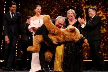 Direktur Festival Film Internasional Berlinale ke-69 Dieter Kosslick (ketiga kanan) menerima boneka beruang dari Presiden Dewan Juri Internasional Juliette Binoche saat malam penghargaan Festival Film Internasional Berlinale ke-69 di Berlin, Jerman, Sabtu (16/2/2019) malam waktu setempat. ANTARA FOTO/Reuters/Hannibal Hanschke/wsj.