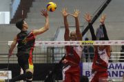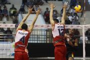 Pebola voli putra Palembang Bank Sumsel Babel, Alfredo Zequeira Cairo (kanan) melakukan smes yang berusaha ditahan pebola voli Surabaya Bhayangkara Samator, Mahfud Nurcahyadi (kiri) dan Rivan Nurmulki (tengah) dalam pertandingan Final Four Proliga 2019 di GOR Ken Arok, Malang, Jawa Timur, Minggu (17/2/2019). Surabaya Bhayangkara Samator berhak lolos ke Grand Final setelah mengalahkan Palembang Bank Sumsel Babel dengan skor 3-0 (25-21, 25-20, 25-23). ANTARA FOTO/Ari Bowo Sucipto/pras.