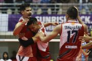 Pebola voli putra Surabaya Bhayangkara Samator melakukan selebrasi usai mengalahkan Palembang Bank Sumsel Babel dalam pertandingan Final Four Proliga 2019 di GOR Ken Arok, Malang, Jawa Timur, Minggu (17/2/2019). Surabaya Bhayangkara Samator berhak lolos ke Grand Final setelah mengalahkan Palembang Bank Sumsel Babel dengan skor 3-0 (25-21, 25-20, 25-23). ANTARA FOTO/Ari Bowo Sucipto/pras.