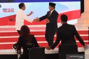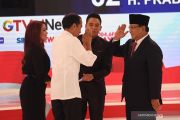Capres nomor urut 01 Joko Widodo (kedua kiri) dan Capres nomor urut 02 Prabowo Subianto (kanan) saling memberi salam seusai debat capres 2019 disaksikan moderator di Hotel Sultan, Jakarta, Minggu (17/2/2019). Debat itu mengangkat tema energi dan pangan, sumber daya alam dan lingkungan hidup, serta infrastruktur. ANTARA FOTO/Akbar Nugroho Gumay/pras.