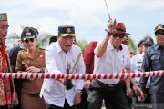 Menteri Perhubungan Budi Karya Sumadi (ketiga kiri) bersama Menteri Hukum dan HAM Yasonna Hamonangan Laoly (keempat kiri) didampingi Wali Kota Singkawang Tjhai Chui Mie (kedua kiri) memotong pagar pintu masuk ke kawasan lahan pembangunan bandara, di Singkawang, Kalbar, Senin (18/2/2019). Pembangunan bandara baru di Kota Singkawang yang akan memiliki landasan pacu ultimate sepanjang 2.500 meter dan mampu menampung pesawat Boeing 737-900 ER tersebut ditargetkan akan selesai pada 2022. ANTARA FOTO/David/jhw/hp.