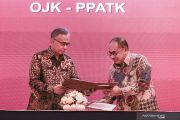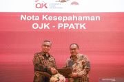 Ketua Dewan Komisioner OJK Wimboh Santoso (kiri) bersama Ketua PPATK Kiagus Ahmad Badaruddin (kanan) melakukan penandatanganan nota kesepahaman (MoU) di Jakarta, Selasa (19/2/2019). MoU tersebut merupakan perpanjangan dari sebelumnya dalam rangka pencegahan dan pemberantasan tindak pidana pencucian uang dan pendanaan terorisme. ANTARA FOTO/Hafidz Mubarak A/pras.