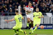Pemain Barcelona Ousmane Dembele (tengah) berebut bola dengan pemain Lyon Bertrand Traore dan Marcelo dalam laga leg pertama babak 16 besar Liga Champions, di Stadion Groupama, Lyon, Perancis, Selasa (19/2/2019). Pertandingan ini berakhir imbang 0-0. ANTARA FOTO/Reuters-Emmanuel Foudrot/hp.