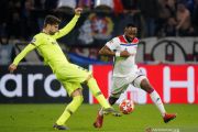 Pemain Barcelona Gerard Pique (kiri) berebut bola dengan pemain Lyon Moussa Dembele dalam laga leg pertama babak 16 besar Liga Champions, di Stadion Groupama, Lyon, Perancis, Selasa (19/2/2019). Pertandingan ini berakhir imbang 0-0. ANTARA FOTO/Reuters-Paul Pelissier/hp.