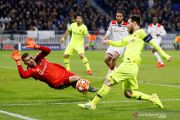 Penjaga gawang Lyon Anthony Lopes melakukan penyelamatan dari serangan pemain depan Barcelona Lionel Messi dalam laga leg pertama babak 16 besar Liga Champions, di Stadion Groupama, Lyon, Perancis, Selasa (19/2/2019). Pertandingan ini berakhir imbang 0-0. ANTARA FOTO/Reuters-Emmanuel Foudrot/hp.