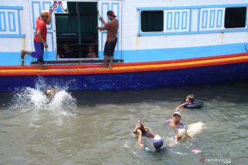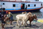 Sejumlah buruh angkut menurunkan sapi dengan cara dilempar ke laut dari perahu motor di Pelabuhan Kalbut, Mangaran, Situbondo, Jawa Timur, Kamis (21/2/2019). Proses bongkar muat hewan ternak seperti sapi dan kambing dari kepulauan Madura terpaksa dilempar ke laut karena perahu motor tidak dapat merapat ke dermaga. ANTARA FOTO/Seno/ama.