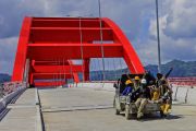 Pekerja melintasi Jembatan Holtekamp yang menjadi ikon Jayapura di Jayapura, Papua, Kamis (28/2/2018). Jembatan Holtekamp yang menyambungkan Kota Jayapura dengan Distrik Muara Tami rencananya akan diresmikan oleh Presiden Joko Widodo pada Maret mendatang. ANTARA FOTO/Gusti Tanati/foc.
