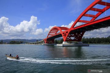Warga melintasi Jembatan Holtekamp yang menjadi ikon Jayapura menggunakan perahu motor di Jayapura, Papua, Kamis (28/2/2018). Jembatan Holtekamp yang menyambungkan Kota Jayapura dengan Distrik Muara Tami rencananya akan diresmikan oleh Presiden Joko Widodo pada Maret mendatang. ANTARA FOTO/Gusti Tanati/wpa/foc.