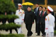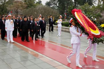 Pemimpin Korea Utara Kim Jong Un mengikuti upacara peletakan karangan bunga di Mausoleum Ho Chi Minh di Hanoi, Sabtu (2/3/2019). ANTARA FOTO/ REUTERS/Jorge Silva/pras.