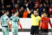 Wasit Ivan Kruzliak (kedua kanan) mengganjar pemain Arsenal Sokratis Papastathopoulos (kiri) dengan kartu merah saat pertandingan leg pertama babak 16 besar Liga Europa antara Stade Rennes dan Arsenal di Roazhon Parks, Rennes, Prancis, Jumat (8/3/2019) dini hari. Arsenal dipaksa bertekuk lutut saat bertandang ke kandang Rennes dengan skor 1-3. ANTARA FOTO/REUTERS/Stephane Mahe/wsj.