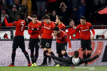 Pemain Stade Rennes Ismaila Sarr (kiri) melakukan selebrasi bersama rekan setimnya usai mencetak gol ke gawang Arsenal saat pertandingan leg pertama babak 16 besar Liga Europa di Roazhon Parks, Rennes, Prancis, Jumat (8/3/2019) dini hari. Arsenal dipaksa bertekuk lutut saat bertandang ke kandang Rennes dengan skor 1-3. ANTARA FOTO/REUTERS/Stephane Mahe/wsj.