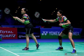 Ganda campuran Indonesia Tontowi Ahmad (kanan) dan Winny Oktavina Kandow beraksi dalam babak perempat final kejuaraan bulutangkis All England melawan pasangan Jepang Arisa Higashino/Yuta Watanabe, di Birmingham Arena, Inggris, Jumat (8/3/2019). ANTARA FOTO/Reuters/Andrew Boyers/hp.