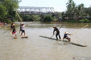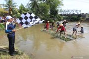 Peserta lomba rakit menyusuri Sungai Air Manna, Sungai Air Manna, Batu Kuning, Bengkulu Selatan, Sabtu (9/3). Lomba yang diikuti oleh puluhan tim tersebut dalam rangka Festival Aiak Manna 2019 guna melestarikan olahraga tradisional sebagai kearifan lokal pendukung pada visit Bengkulu 2020 mendatang. ANTARA FOTO/David Muharmansyah/hp.