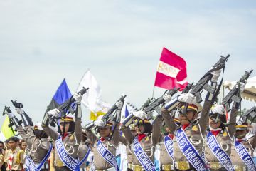 Sejumlah anggota polisi cilik melakukan atraksi pada acara Pataka Relay Millenial Road Safety di Lapangan Galuh Mas Karawang, Jawa Barat, Sabtu (9/3/2019). Aksi polisi cilik tersebut dalam rangka menyambut Pataka Relay Millenial Road Safety untuk mewujudkan Road Safety To Zero Accident. ANTARA FOTO/M Ibnu Chazar/hp.