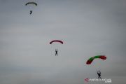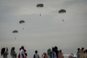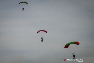 Pelatih penerjun Kopasus melakukan terjun payung saat Wing Day Terjun Para Dasar di Lanud Suparlan, Batujajar, Kabupaten Bandung Barat, Jawa Barat, Selasa (19/3/2019). Sebanyak 258 Taruna Akmil tingkat IV mengikuti pendidikan para dasar dengan melakukan penerjunan statik. ANTARA FOTO/Raisan Al Farisi/pras.