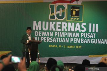 Plt Ketua Umum PPP Suharso Monoarfa memberikan sambutan pada pembukaan Mukernas III Dewan Pimpinan Pusat PPP di Bogor, Jawa Barat, Rabu (20/3/19). Agenda utama Mukernas PPP tersebut adalah pengukuhan Suharso Monoarfa sebagai Pelaksana Tugas Ketua Umum, menggantikan posisi Romahurmuziy yang telah dipecat karena tersandung kasus korupsi.. ANTARA FOTO/Yulius Satria Wijaya/pras.