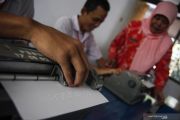Penyandang tuna netra mengikuti pelatihan menulis dengan mesin ketik huruf braille di Rumah Pelayanan Sosial Disabilitas Sensorik Netra Bhakti Candrasa, Solo, Jawa Tengah, Kamis (21/3/2019). Pelatihan tersebut sebagai rangkaian program bimbingan bagi penerima manfaat yang meliputi bimbingan fisik, sosial maupun keterampilan kerja guna melatih kemandirian penyandang tuna netra menghadapi situasi kesehariannya dan kewirausahaan. ANTARA FOTO/Maulana Surya/pras.