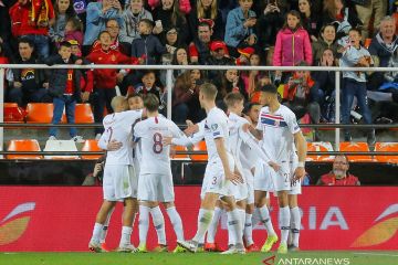 Pemain Norwegia Joshua King melakukan selebrasi bersama rekan rekannya seusai membuat gol ke gawang Spanyol dalam pertandingan babak kualifikasi Piala Eropa 2020 Group F, di Stadion Mestalla, Valencia, Spanyol, Sabtu (23/3/2019). Spanyol akhirnya menang 2-1 atas Norwegia. ANTARA FOTO/Reuters-Heino Kalis/hp.