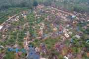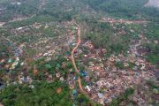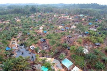 Foto udara Taman Hutan Raya (Tahura) Sultan Thaha Syaifuddin yang telah beralih fungsi dan dipenuhi kolam penampungan minyak dari aktivitas pengeboran minyak ilegal di Bajubang, Batanghari, Jambi, Senin (25/3/2019). Warga setempat menyebutkan, aktivitas pengeboran minyak ilegal yang dilakukan secara terang-terangan di kawasan hutan negara seluas 15.830 hektare tersebut telah berlangsung sejak 2016 dan berdasarkan data Dinas Lingkungan Hidup Kabupaten Batanghari, aktivitas pengeboran minyak ilegal di Tahura tersebut telah merusak 50 hektare lebih kawasan. ANTARA FOTO/Wahdi Septiawan/pras.