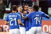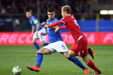 Pesepak bola Italia Stefano Sensi melakukan selebrasi bersama rekan-rekannya usai membuat gol pertama untuk timnya saat melawan Liechtenstein pada pertandingan Kualifikasi Piala Eropa 2020 Grup J, di Stadion Ennio Tardini, Parma, Italia, Selasa (26/3/2019). Italia melumat perlawanan Liechtenstein 6-0. ANTARA FOTO/Reuters-Jennifer Lorenzini/hp.
