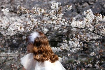 Seorang perempuan berpose saat sesi pemotretan di dekat bunga Cherry Blossom yang hampir mekar penuh di Tokyo, Jepang, Rabu (27/3/2019). ANTARA FOTO/REUTERS/Issei Kato/wsj.