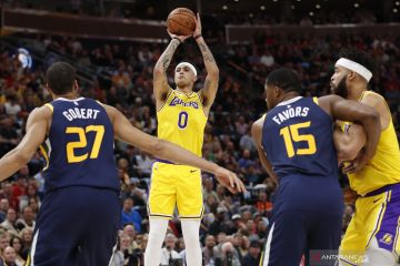 Pebasket Los Angeles Lakers Kyle Kuzma (0) memasukkan bola ke arah ring lawannya Utah Jazz yang di jaga Rudy Gobert (27) dan Derrick Favors (15) pada kuarter pertama pertandingan lanjutan NBA, di Vivint Smart Home Arena, Salt Lake City, AS, Rabu (27/3). Utah Jazz berhasil mengalahkan Lakers 115 -100. ANTARA FOTO/Reuters-Jeff Swinger/hp.