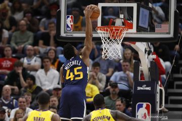 Pebasket Utah Jazz Donovan Mitchell (45) menjaga serangan pebasket Los Angeles Lakers Kyle Kuzma (0) pada quarter kedua pertandingan lanjutan NBA, di Vivint Smart Home Arena, Salt Lake City, AS, Rabu (27/3). Utah Jazz berhasil mengalahkan Lakers 115 -100. ANTARA FOTO/Reuters-Jeff Swinger/hp.