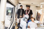 Direktur Utama Bank Mega Kostaman Thayib (kanan) didampingi dengan Ketua Yayasan Miftahul Bariyyah Faisal Fajri Al Amin (kiri) berbincang dengan siswa saat meninjau pemeriksaan gigi gratis di SMK Miftahul Bariyyah, Subang, Jawa Barat, Jumat (29/3/2019). Program Mega Berbagi merupakan kepedulian Bank Mega kepada dunia pendidikan melalui pembangunan kembali bangunan sekolah yang rusak dan pengadaan fasilitas pendukung proses belajar mengajar. ANTARA FOTO/M Agung Rajasa/hp.