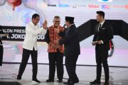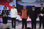 Capres nomor urut 01 Joko Widodo dan capres nomor urut 02 Prabowo Subianto bersama Ketua KPU Arief Budiman tiba dipanggung untuk mengikuti debat capres putaran keempat di Hotel Shangri La, Jakarta, Sabtu (30/3/2019). Debat itu mengangkat tema Ideologi, Pemerintahan, Pertahanan dan Keamanan, serta Hubungan Internasional. ANTARA FOTO/Hafidz Mubarak A/pras.