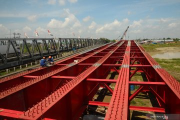 Pekerja menyelesaikan pembangunan Jembatan Kolonel Sunandar atau Tanggulangin III di jalan jalur Pantura Kudus-Demak, Jawa Tengah, Selasa (2/4/2019). Kementerian Pekerjaan Umum dan Perumahan Rakyat (PUPR) membangun jembatan sepanjang 170 meter yang menjadi akses vital jalan Pantura Jawa Tengah bagian timur yang ditargetkan selesai H-15 Idulfitri 2019. ANTARA FOTO/Yusuf Nugroho/foc.
