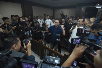 Terdakwa Gubernur nonaktif Aceh Irwandi Yusuf (tengah) berbincang dengan awak media sebelum menjalani sidang dengan agenda pembacaan putusan kasus dugaan suap Dana Otonomi Khusus Aceh (DOKA) tahun 2018, di Pengadilan Tipikor, Jakarta, Senin (8/4/2019). Majelis hakim memvonis Irwandi Yusuf dengan hukuman pidana tujuh tahun penjara denda Rp300 juta subsider tiga bulan kurungan, Hendri Yusal empat tahun penjara denda Rp200 juta subsider tiga bulan, dan Saiful Bahri lima tahun penjara denda Rp300 juta subsider tiga bulan kurungan. ANTARA FOTO/Indrianto Eko Suwarso/hp.